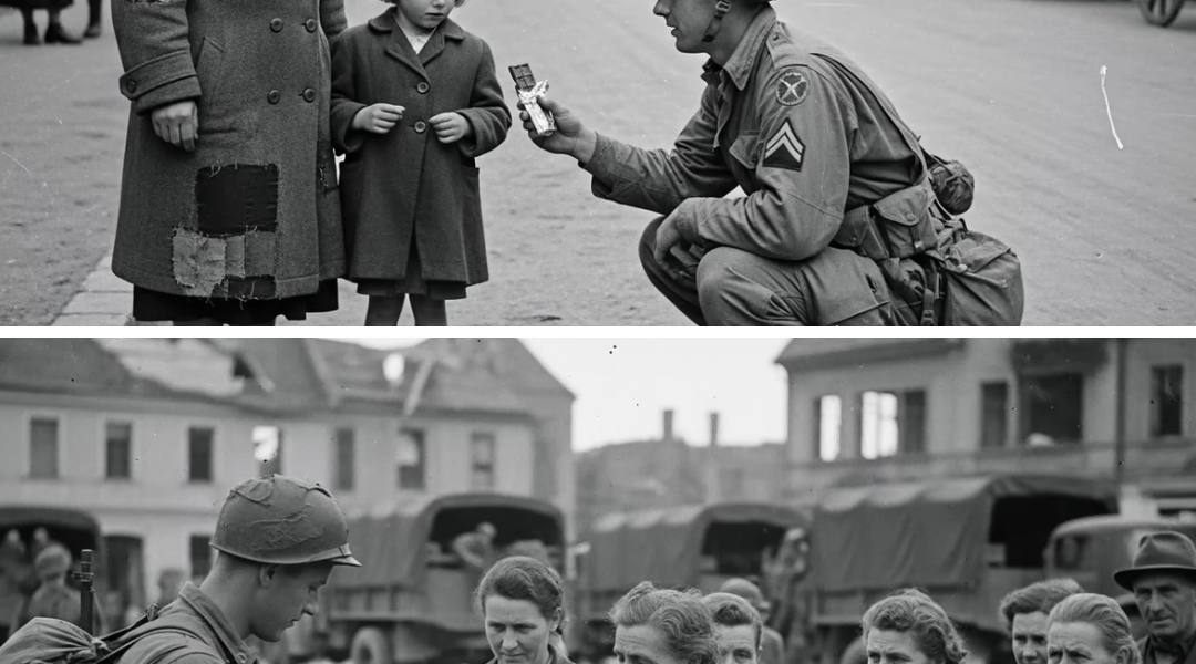 The American soldier smiled warmly, and with a simple “Beata,” a word that sounded clumsy but sincere in broken German, he handed Greta the larger piece of the chocolate bar, breaking it in half with gentle care. It was a small act, but for Helga, it felt like a seismic shift. Her heart swelled with confusion, and her mind raced to make sense of what she was seeing. This man, who according to everything she had been told, should have been a ruthless, inhuman enemy, was offering kindness and generosity that no German soldier, much less a Nazi propagandist, would ever have shown.