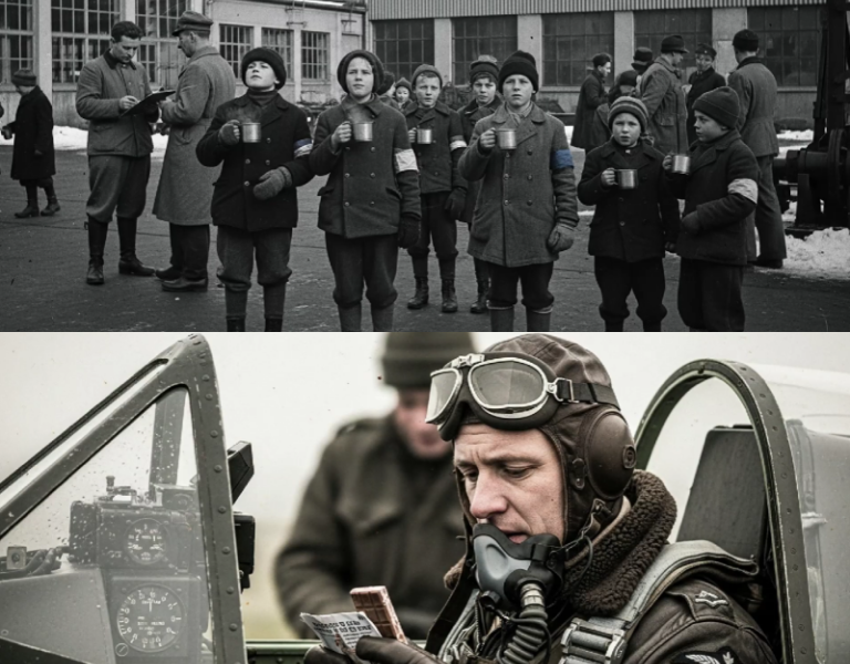 Post-war interviews filled in the courtyard’s details. The children were students from a technical training school sharing facilities with the Arado factory, learning metalwork and mechanics because the war had eaten men. They were gathered for an outdoor assembly, holding metal cups of hot soup—a small trick of warmth in a winter that had no time for children.