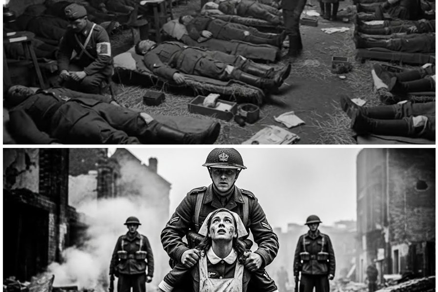 She stood beside a makeshift medical tent fashioned from torn canvas and salvaged poles. Her uniform identified her as a German nurse. Her hands were steady. Her expression unreadable.