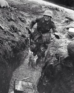 Es gibt Bilder aus dem Zweiten Weltkrieg, die mehr sagen als jede Zahl oder Statistik. Das Foto eines Wehrmacht-Melders, aufgenommen im Frühjahr 1943 an der Ostfront, gehört zu diesen seltenen Momentaufnahmen. Man sieht einen jungen Soldaten, der mit verzerrtem Gesichtsausdruck durch einen schlammigen Schützengraben rennt, während Wasser aufspritzt und der Regen die Erde in eine tödliche Falle verwandelt hat. In seiner Hand hält er eine Tasche mit Meldungen – vielleicht Befehle, vielleicht Hilferufe, vielleicht die letzte Chance, eine Einheit vor dem Untergang zu retten.