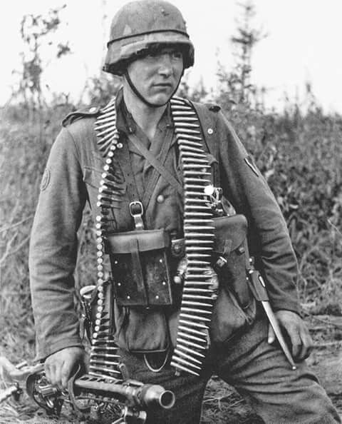 Es ist zu erkennen, dass der Soldat im Vordergrund mit einem MG-42-Maschinengewehr bewaffnet ist.