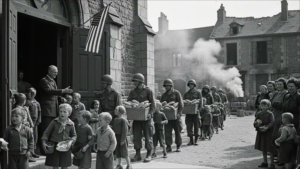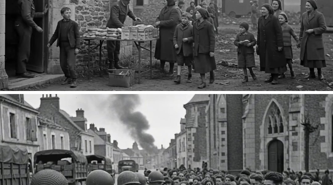 In the village church, now flying an American flag, a group of American soldiers—men she had once feared—were distributing thick slices of white bread slathered with butter and jam. Dozens of wide-eyed children, including Pierre, eagerly filled their hands with the precious food. For a moment, Marie felt as though she were in a dream. The food, a luxury unimaginable just weeks earlier, seemed too good to be true.