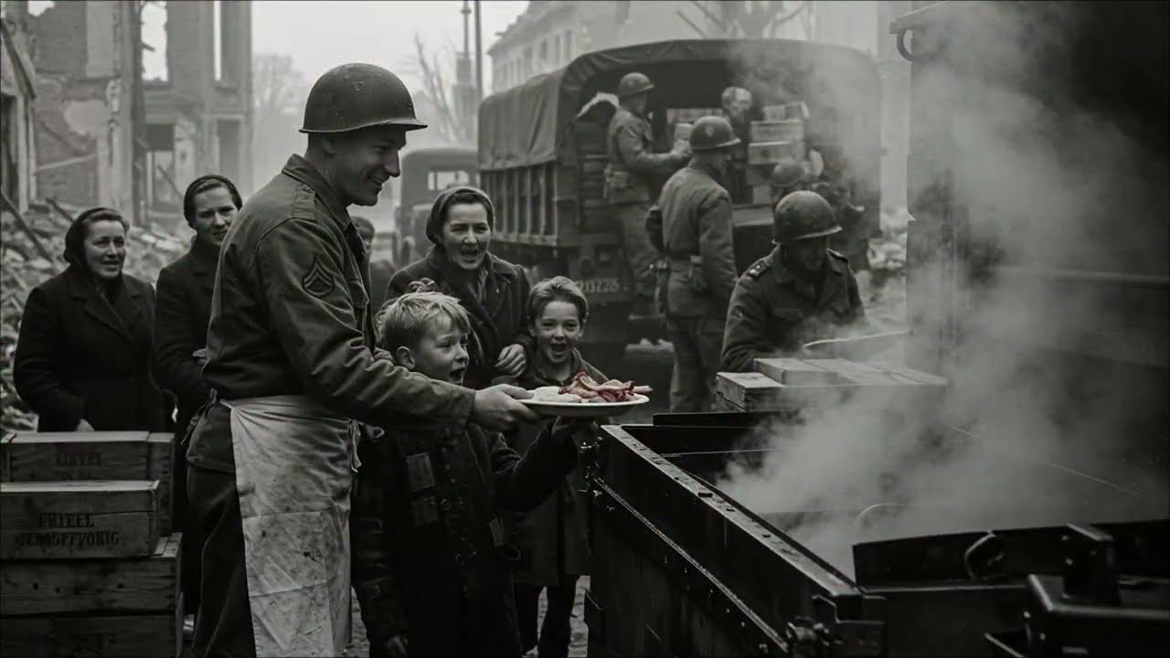 As she rounded a corner, the scene before her shattered everything she had been taught. A group of American soldiers stood around a field kitchen, preparing food, and serving it with ease. To her horror and disbelief, they were offering food not just to their own, but to German children—her own daughter included. “For the little one,” said a young American lieutenant, tipping his hat with a grin, as he handed Greta a plate piled high with scrambled eggs, bacon, and toast, a combination Martha hadn’t seen in years.