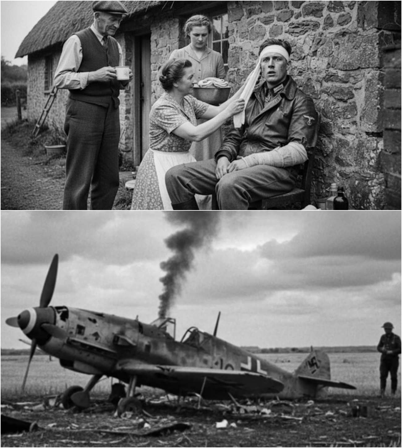 Fighter pilot Friedrich Weber landed in a village garden. An elderly woman came out with a rolling pin, ready to defend her property, then saw he was bleeding and lowered it. She bandaged his arm with strips torn from a tablecloth and sat with him until authorities arrived. No German. No English. Just silence shared between an old British woman and a wounded enemy.