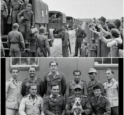 He looked around: rows of white-painted wooden barracks, clean windows, new tin roofs—no damp darkness, no rotting trenches, just pinewood and morning earth. The Americans nearby didn’t glare; one wrote on a clipboard, joking with his buddy, both laughing openly. No one gripped rifles like they awaited an excuse to strike. A black MP smiled at the prisoners’ confusion. Wilhelm lowered his gaze, afraid to return it, still believing any misstep brought punishment. But none came. One soldier pointed to a long building: “Straight inside, gentlemen. Breakfast is almost ready.” Breakfast. The word nearly made Wilhelm laugh, his throat too dry for sound.