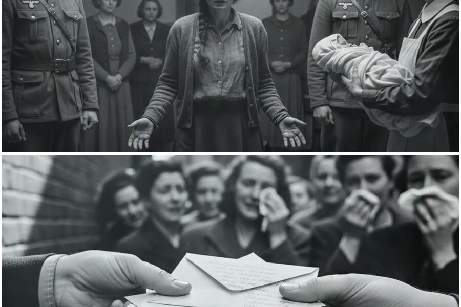She was older, her hair pulled back tightly, her coat mended at the elbows. She listened carefully as a soldier searched through a stack, then held out an envelope.