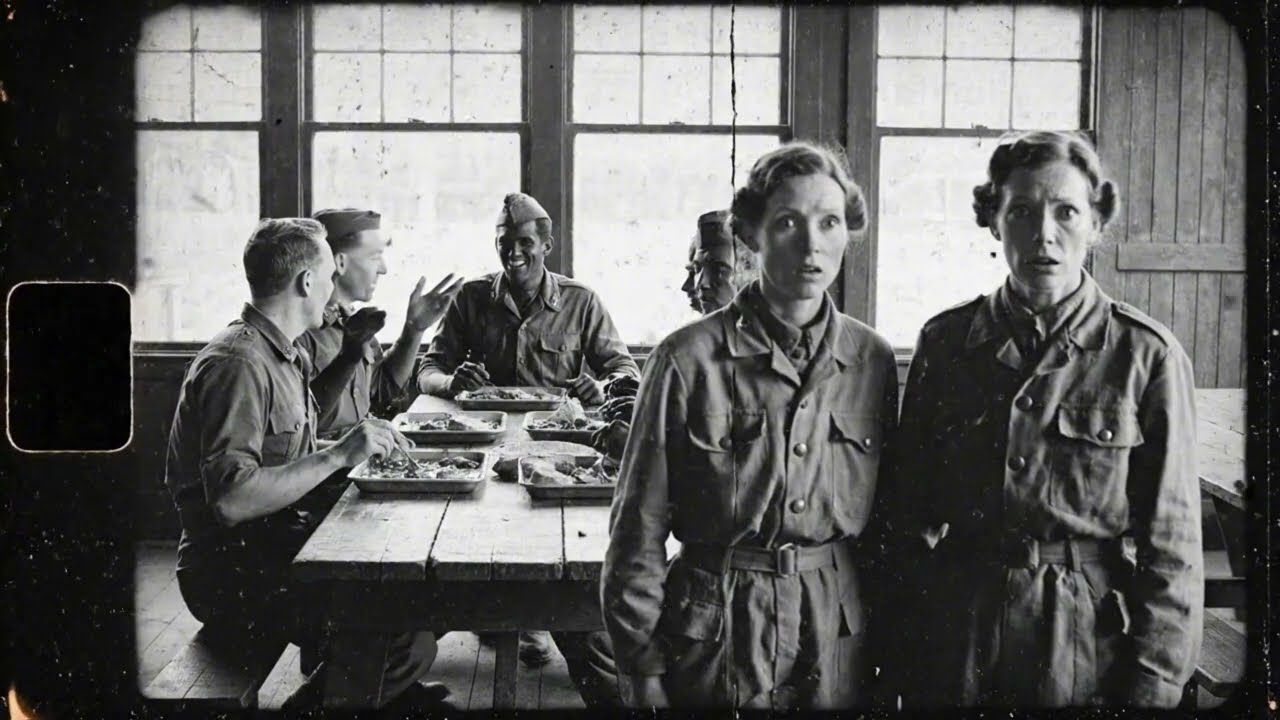 The guards led us forward. I stepped down from the truck last, my legs shaking from the long voyage across the Atlantic, my body still adjusting to the new air. We were taken to a long, low building—Camp Hearn’s mess hall. The door swung open, and I froze. Inside, I heard the soft clatter of metal plates, the scrape of chairs on wood, the hum of ordinary conversation. I could barely comprehend it.