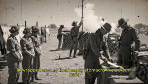 Beyond the barbed wire and guard towers, the source of that smoke revealed itself: American cowboys in sweat-stained denim, boots planted wide, turning massive ribeye steaks on a row of iron grills. The slabs glistened under the fading light, edges charred, juices hissing into the flames. Helen Bower, 21, a former auxiliary radio operator from Hamburg, gripped her cloth bag until her knuckles whitened. The sheer size of the meat felt absurd, unreal—like something from pre-war festivals or a postcard her brother had once smuggled home.