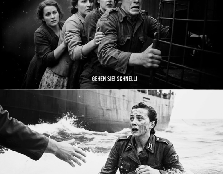 A rope was thrown. A life ring splashed. The Americans in the water fought like they were wrestling a monster—waves slamming them, ice-cold shock stealing strength. One of them latched onto the German prisoner and began hauling him toward the line.