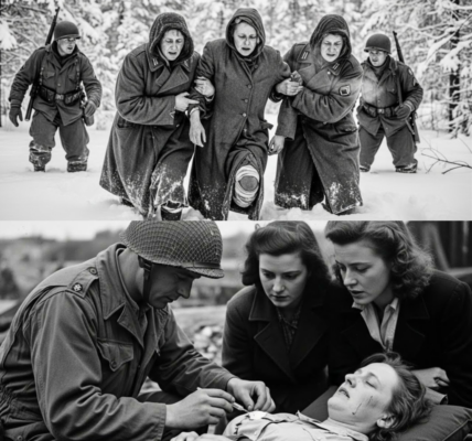 A young woman appeared in the doorway. She didn’t step in immediately. She gripped the door frame like it was a crutch, her fingers white with effort, as if the room itself might knock her down. She wore a faded German uniform that hung on her like an oversized coat. Her hair was pulled back, but the style couldn’t hide how thin her face was. Her eyes looked too large, as if her skull had become a little too big for the rest of her.