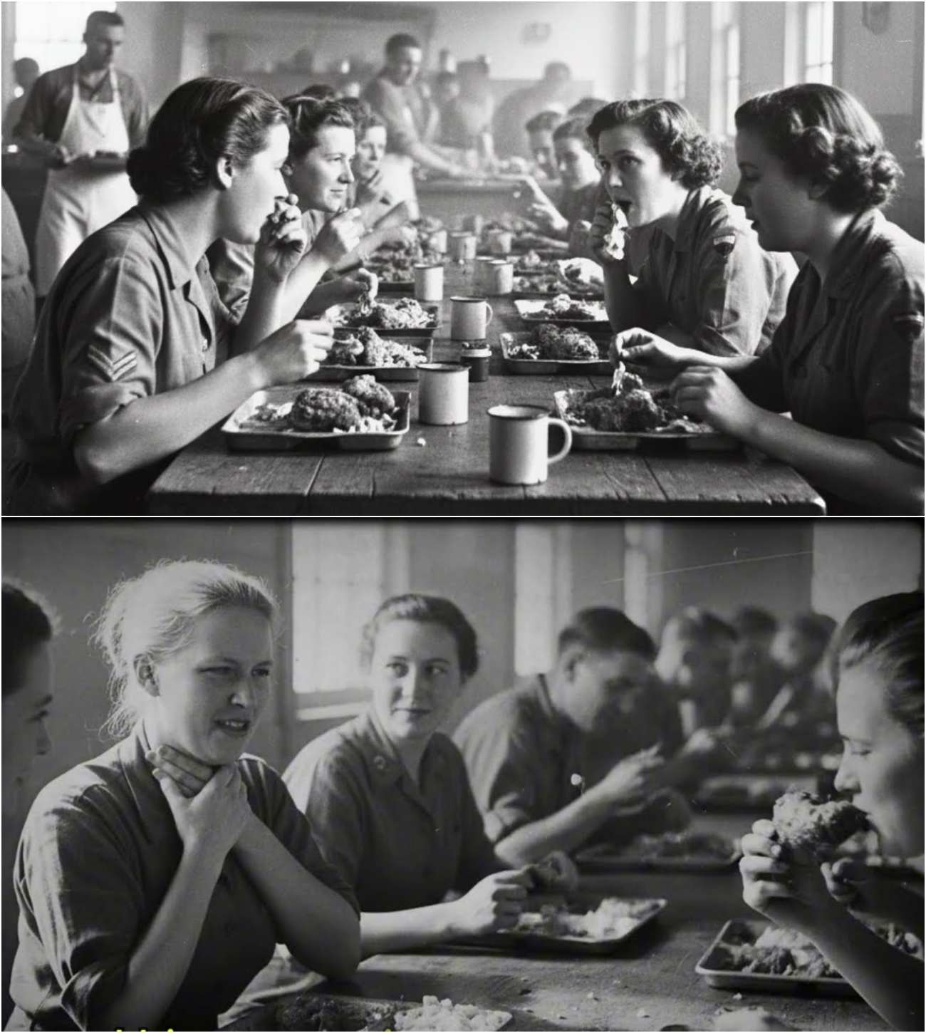 Hildegard noticed something unsettling. At nearby tables, male German POWs—men who had been at Camp Swift longer—were eating the same chicken with unmistakable enthusiasm. Fingers shiny with grease. Faces relaxed. Happy.