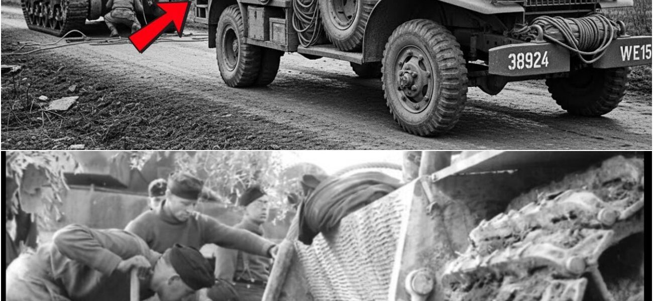 Un enorme T-recker diamantato, uno di quei pesanti e ingombranti bestioni 6×6 progettati per trainare i carri armati, sta sgommando inutilmente. È troppo pesante. È troppo largo. Ha cercato di uscire dalla strada per raggiungere uno Sherman in panne. E ora, invece di un solo veicolo bloccato, l’esercito ne ha due. Il motore del carro attrezzi ruggisce, lanciando pennacchi di fumo nero diesel nel cielo grigio, ma non si muove di un millimetro.