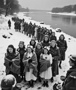 Ihre Uniformen sind steif, vom Eis verhärtet. Sie warten darauf, im Schnee zurückgelassen zu werden, um zu sterben. Die US-Patrouille unter der Führung von Sergeant Thomas „Tommy“ Riley aus Boston – 26 Jahre alt, irisch-amerikanischer Abstammung – findet sie zusammengekauert in einer eingestürzten Scheune. Ihre Lippen sind bläulich, sie zittern unkontrolliert. Eine von ihnen, Anna Becker , eine 21-jährige Krankenschwester aus München, flüstert mit klappernden Zähnen: