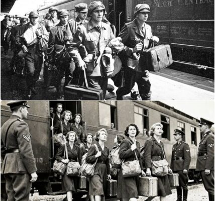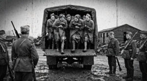 A British convoy rolled in, trucks in dull green, tires cutting mud. Inside sat twelve young German women, faces streaked with soot and fear. Some had worked in kitchens, others as nurses, rumors whispered darker tales. The soldiers guarding them didn’t pry. When the truck stopped at a makeshift camp, they were ordered out. Boots sank into mud, wind tearing thin dresses. A sergeant barked: “Line up. Hands visible.” They froze, glancing at each other. The tone was authority, the echo of power lost.