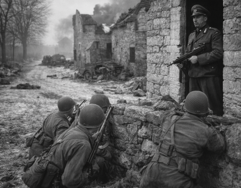 The commander frowned and sent a runner. The Germans were still there, and someone was directing them. Through binoculars, an American lieutenant caught a brief glimpse of a figure in the doorway of the largest building. The man stood perfectly still. Long coat. Field cap pulled low. Pistol holstered. Binoculars hanging from his neck. He wasn’t shouting. He wasn’t firing wildly. He was watching, like a man timing something.