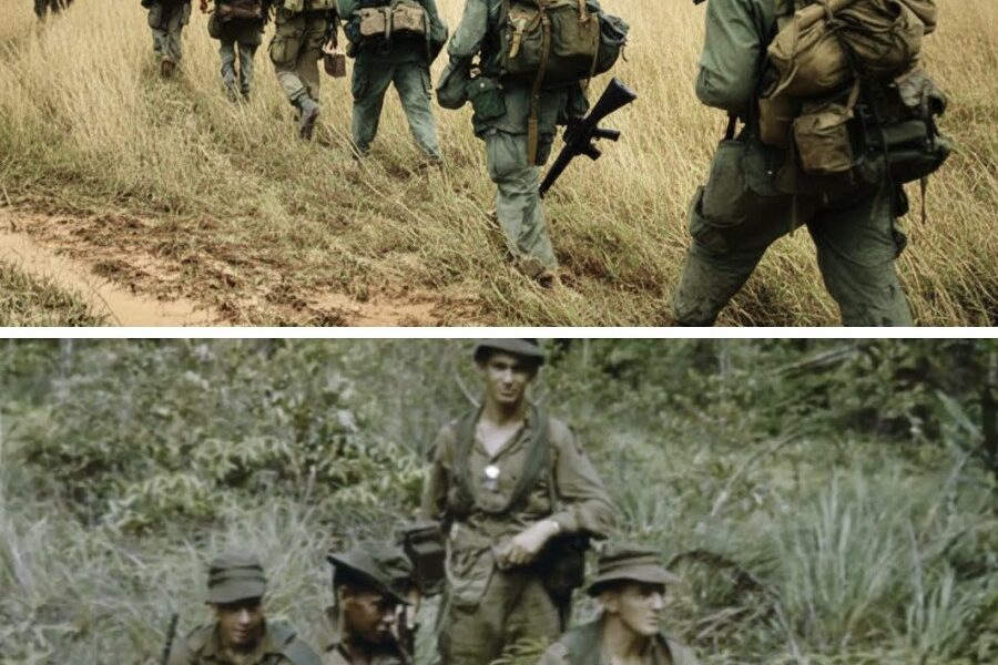 Five men slid out of the treeline like they’d been produced by the foliage itself. They were dirty, calm, and looked like they’d already walked this route ten times. Their shirts were jungle green, bleached by sun and sweat. Their webbing was patched with local fabric. One had a machete wrapped in cloth and tape so it wouldn’t click against its sheath. Another had electrical tape around his weapon to stop metal-on-metal noise. They carried no radios. No laminated map pouch. No obvious “system.”