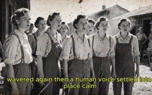 The voice was calm. Unhurried. It was the kind of voice that should belong in kitchens and living rooms, not a camp surrounded by fences and watchtowers. The static cleared as the announcer spoke, introducing the weather: a chance of rain, humidity in the air, and no sense of urgency at all. It was a weather forecast meant for farmers, not soldiers. The casual tone struck her, and she paused, needle halfway through cloth, listening.