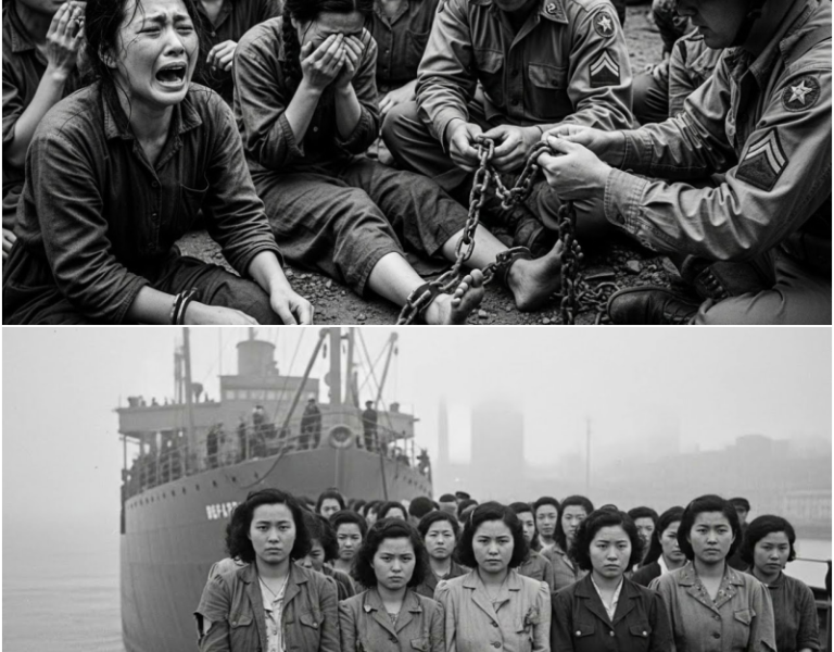 In the gray dawn of early September 1945, a transport ship cut slowly through the mist of a quiet Pacific harbor. The water was calm, almost deceptively peaceful, as if the world itself were trying to forget what it had just survived. On the lower deck, forty-three Japanese women sat shoulder to shoulder, their wrists sore from iron restraints, their faces hollow from months of fear and uncertainty.